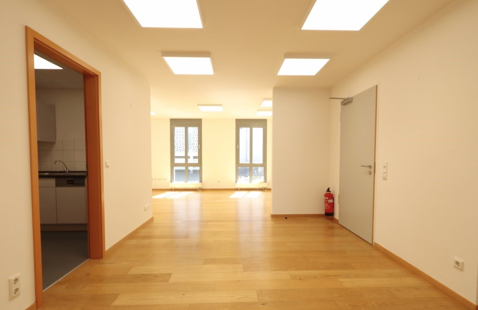 Ausgestattet ist die über einen Aufzug zu erreichende Büroetage mit Parkettboden und einer Einbauküche.
